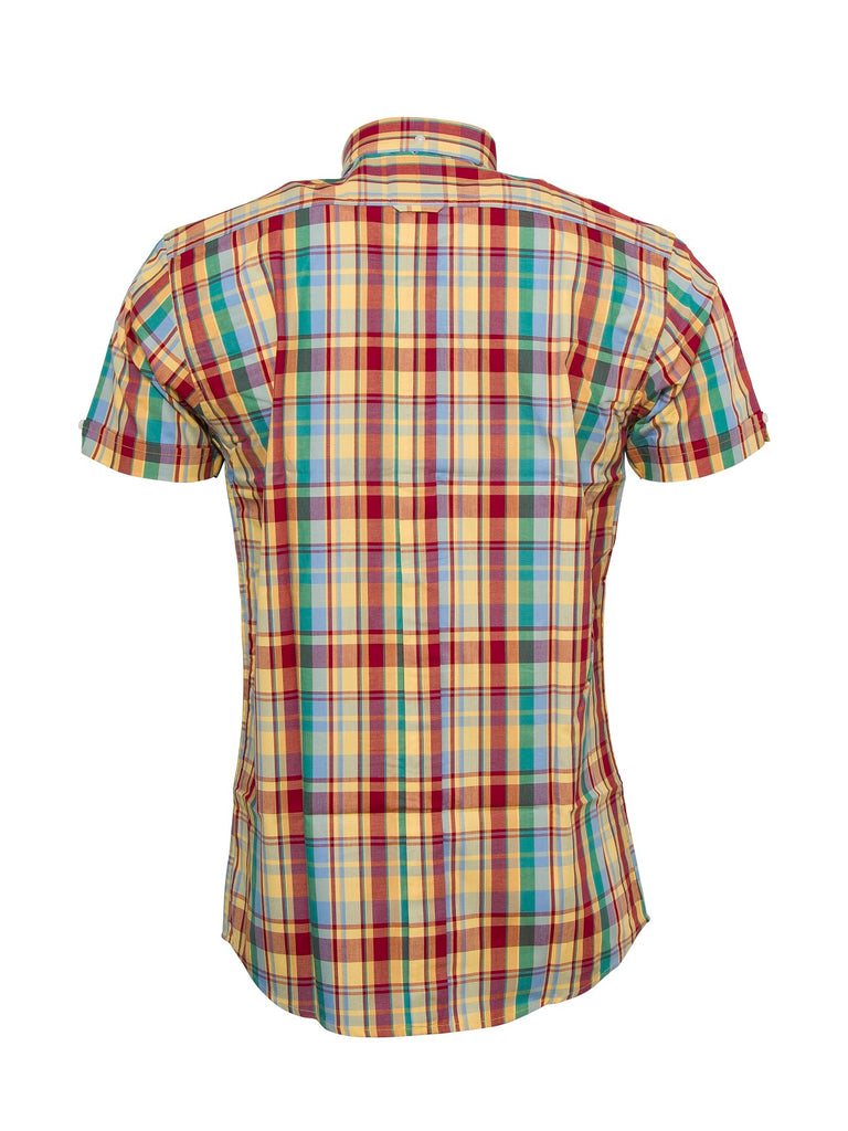 Men's limited edition Multi check shirt, complete with our iconic 3 finger button down collar, full length back box pleat, V- Cut out on sleeve.