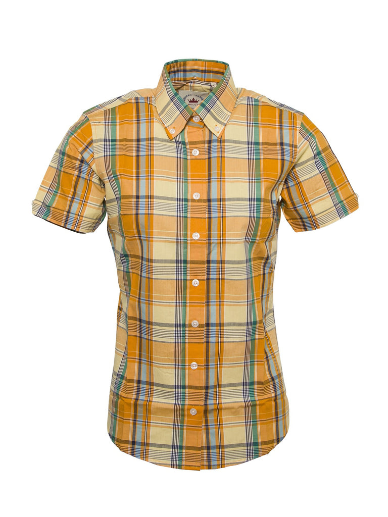 Ladies short sleeve button down shirt in a Orange check design